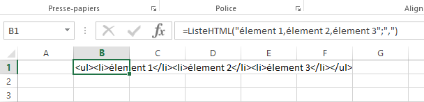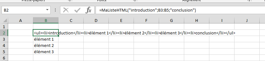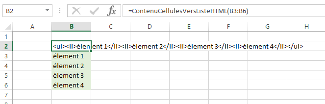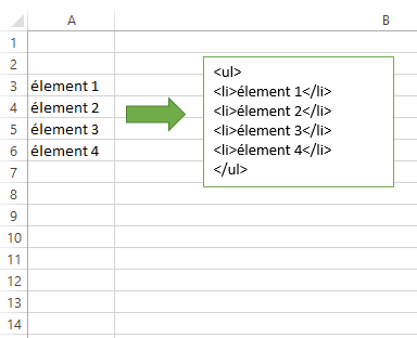 Si vous créez des sites internet, le code VBA suivant vous sera peut-être utile: il crée des listes HTML (donc la structure "<ul><li>élément 1</li><li>…</li></ul>") automatiquement à partir des chaînes de caractères, à partir du contenu des cellules ou le mélange des deux.