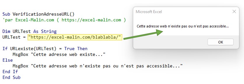 Sub VerificationAdresseURL() 'par Excel-Malin.com ( https://excel-malin.com ) Dim URLTest As String URLTest = "https://excel-malin.com/a-propos/" If URLexiste(URLTest) = True Then MsgBox "Cette adresse web existe..." Else MsgBox "Cette adresse web n'existe pas ou n'est pas accessible..." End If End Sub |
