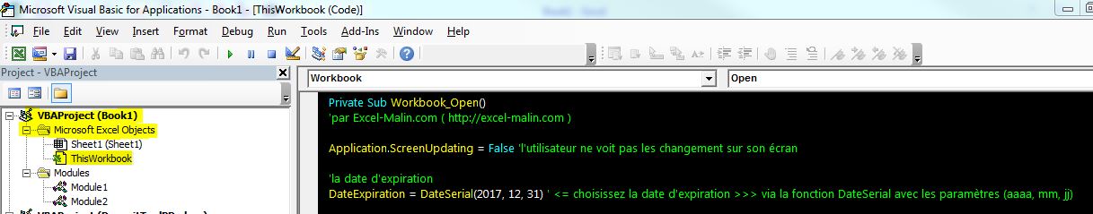 - Le code VBA de base qui permet de déclencher une expiration de fichier Excel