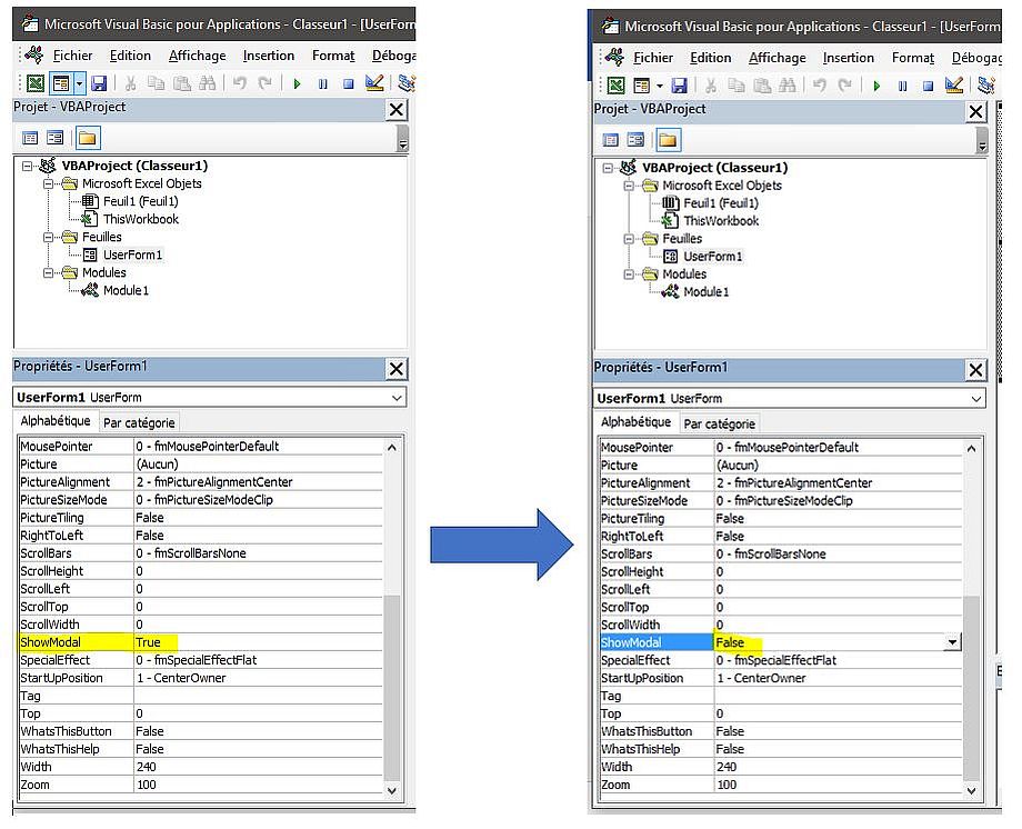 Comme mentionné plus haut, un Formulaire VBA (UserForm) peut être affiché en deux modes ce qui modifie substantiellement son comportement et également la manière d'utiliser les Formulaires dans une application basée sur Excel/VBA. Voici les explications