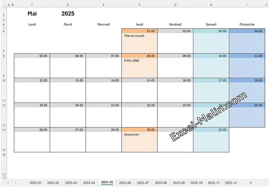 | Calendrier mensuel 2025 Excel – sans jours fériés | Télécharger version Excel | Télécharger version PDF |