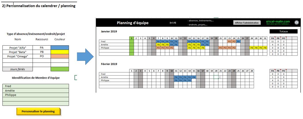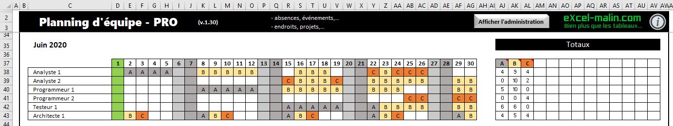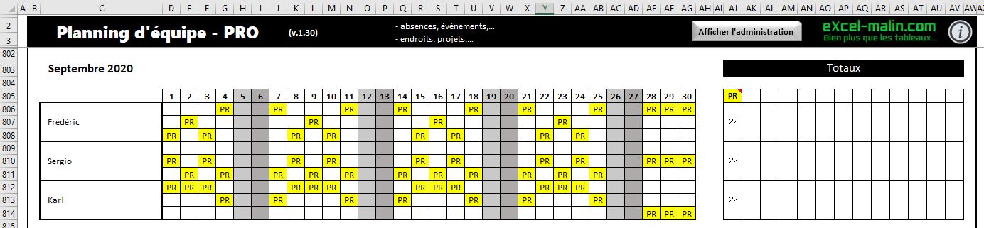 - une version "PRO": cette version a plusieurs fonctionnalités supplémentaires (suivi par demi-journées et par 3 shifts, choix du mois du début du planning, possibilité de verrouiller l'Administration, possibilité de cacher le logo Excel-Malin.com etc.) et elle peut gérer des équipes beaucoup plus importantes: jusqu'à 1.000 membres et jusqu'à 13 types d'absences / de projets / de localisations différents. Elle est donc idéale pour des entreprises et des plus grandes équipes.