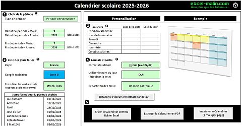 L'utilisation de cet outil est tout à fait simple et intuitive. Il contient deux parties – la partie "Administration" et le calendrier même. Les deux se trouvent sur la même Feuille.