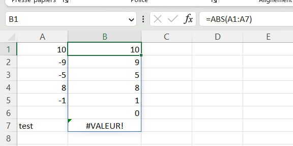 ==> résultat = la valeur absolue du nombre qui se trouve dans la cellule B2.=ABS(12-55)