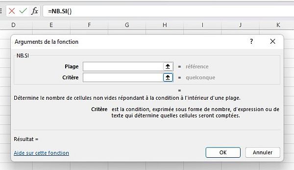 Les paramètres de la fonction NB.SI