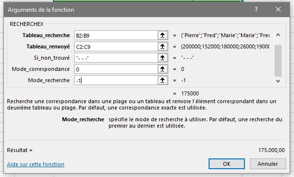 =RECHERCHEX(Valeur_cherchée; Tableau_recherche; Tableau_renvoyé; Si_non_trouvé; Mode_correspondance; Mode_recherche)
