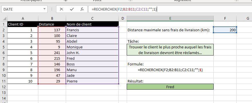 Un exemple de la nouvelle fonctionnalité de RECHERCHEX qui vous permet de trouver la valeur plus grande la plus proche de la valeur recherchée. Notez que tout se joue au niveau du 5ème argument de la fonction…