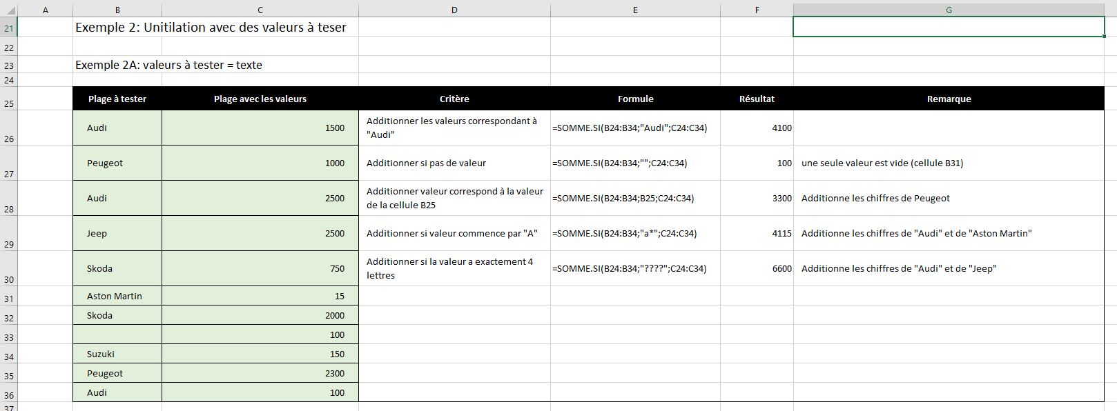 - texte exact: par exemple "Peugeot". Fait la somme des cellules qui correspond aux cellules qui contiennent le texte exact "Peugeot".