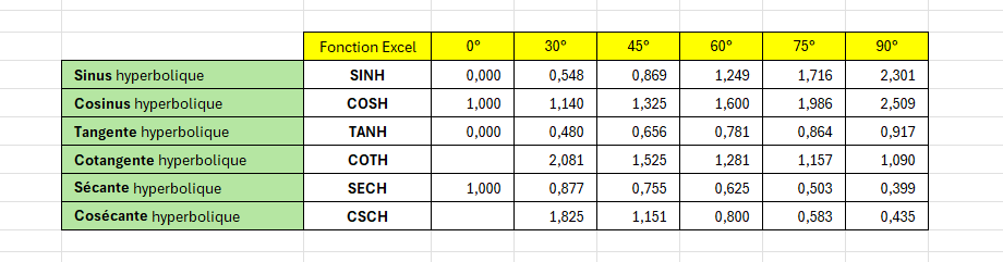 En ce qui concerne les fonctions inverses, Excel propose directement des fonctions dédiées pour les inverses hyperboliques – ACOSH, ASINH, ATANH et ACOTH. Pour l'arc sécante hyperbolique et l'arc cosécante hyperbolique, il est possible de les calculer en utilisant des formules basées sur ACOSH et sur ASINH.