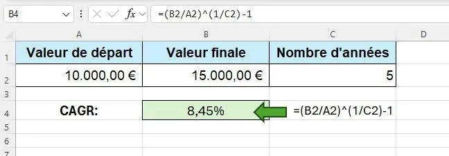Le CAGR obtenu est d'environ 8,45 %. Ce chiffre représente le taux de croissance annuel moyen de votre investissement sur la période de 5 ans. Un CAGR de 8,45 % indique une croissance saine et régulière de l'investissement, reflétant une performance positive sur la durée.