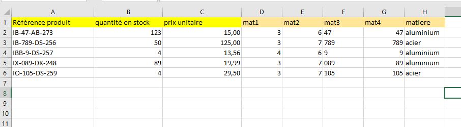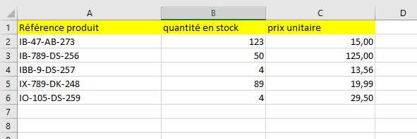 Imaginons que vous ayez une liste de produits avec des références, des prix, et des quantités en stock, comme le montre l'image suivante:
