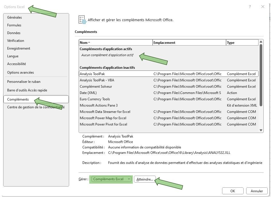 - En bas de la fenêtre des Compléments, vous verrez un menu déroulant. Sélectionnez "Compléments Excel" et cliquez sur "Atteindre…".