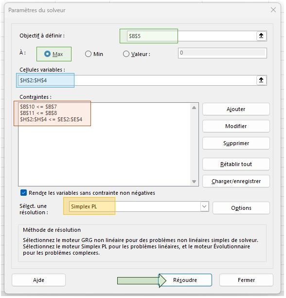 - Type de résolution: Nous allons choisir la méthode "Simplex PL" (voir la section n°5 pour les différentes méthodes)