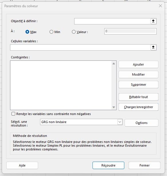 Les modèles non linéaires sont plus difficiles à résoudre que les modèles linéaires. Si vous utilisez des contraintes non linéaires, assurez-vous de bien comprendre leur impact sur le modèle et considérez l'utilisation de la méthode GRG Nonlinéaire pour de meilleurs résultats.