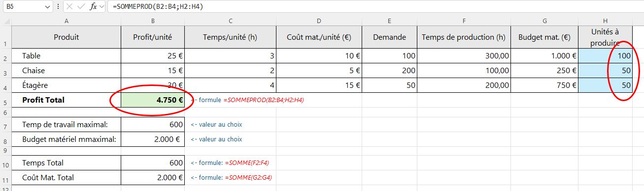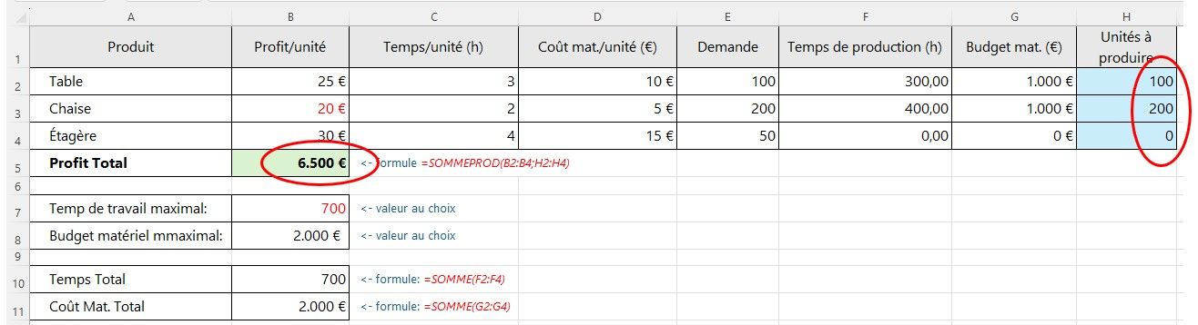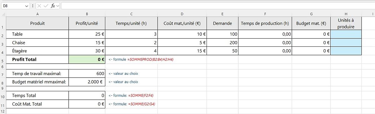 Produit | Profit/unité | Temps/unité (h) | Coût mat./unité (€) | Demande | Temps de production (h) | Budget mat. (€) | Unités à produire |