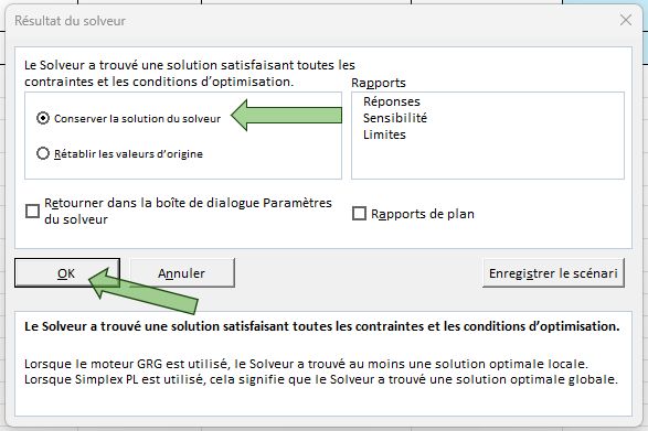 Tout d'abord, le Solveur Excel nous informe qu'il a bien trouvé une solution qui remplit les conditions (il est possible d'avoir une série des conditions qui s'excluent les une des autres et il est donc impossible d'obtenir un résultat).