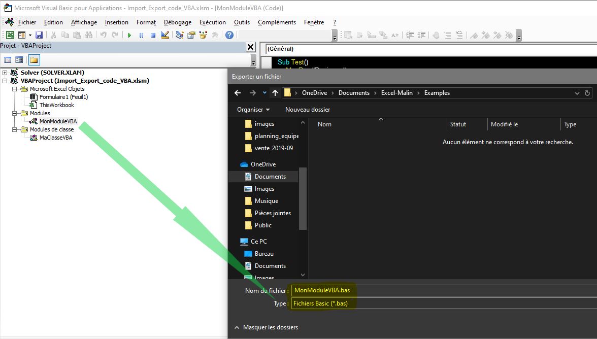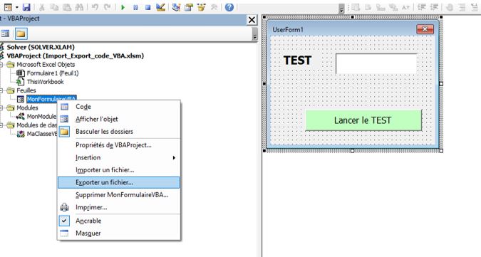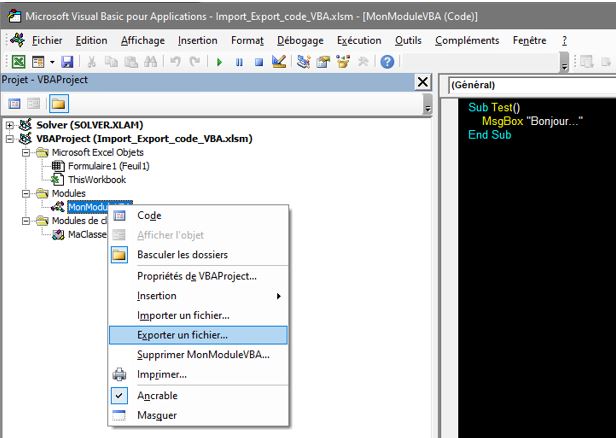 Le code ainsi exporté peut donc être importé dans un autre Projet / Classeur. La procédure est tout aussi simple.